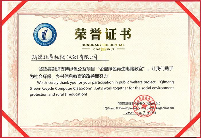 2020年7月14日,斯德拉馬機(jī)械(太倉)有限公司通過企盟信息技術(shù)發(fā)展有限中心捐贈了30余臺舊電腦,所有捐贈的電腦將用于“再生電腦公益行項(xiàng)目”,幫助鄉(xiāng)村小學(xué)建立“綠色再生電腦教室”,為那里的孩子們搭建信息化知識學(xué)習(xí)的平臺。 斯德拉馬太倉堅持做愛心的使者,綠色的行者,努力為社會環(huán)保、鄉(xiāng)村信息教育的改善貢獻(xiàn)自己微薄的力量!
