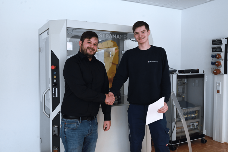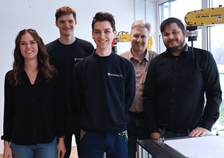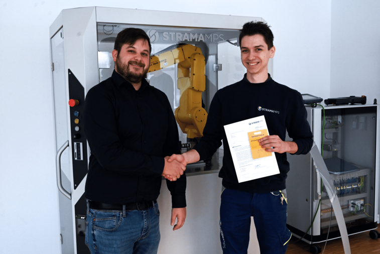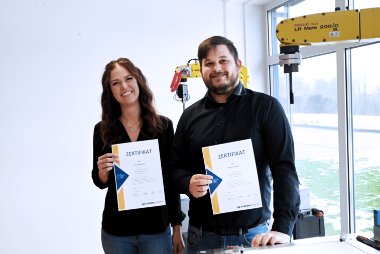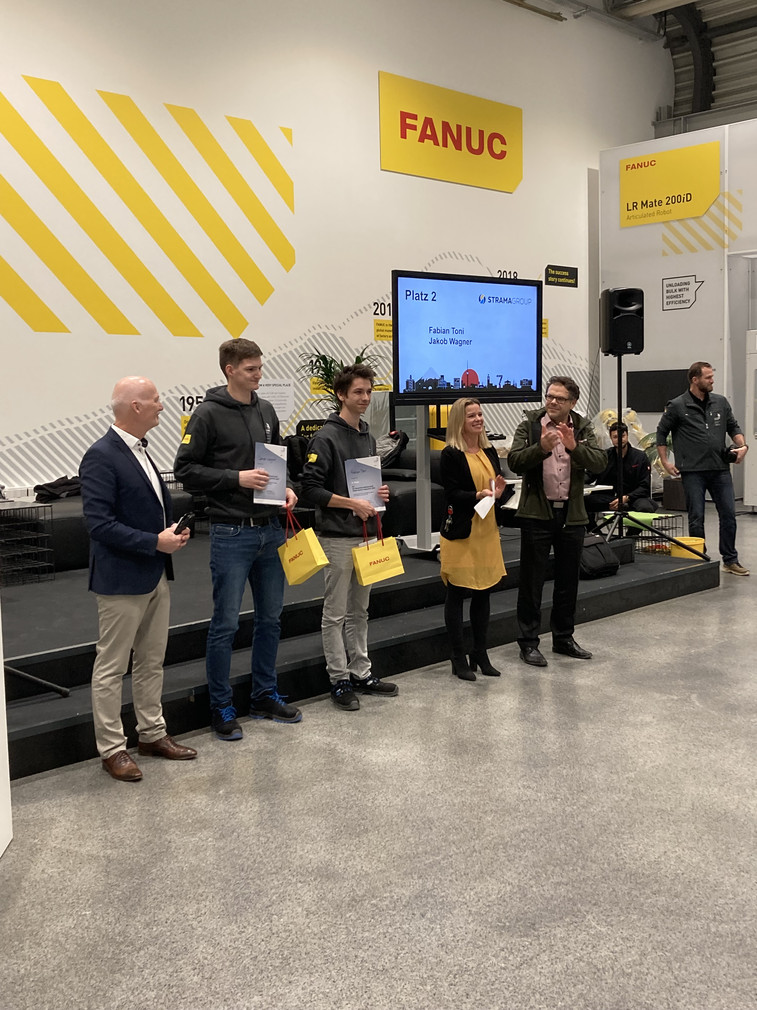 組辦方向Thomas和機器人程序員同事Jessica Anstadt頒發FANUC培訓師證書。此次機器人技能大賽的成功參與要特別感謝他們。作為FANUC學院的官方培訓合作伙伴,他們為Strama集團提供內、外部培訓課程。